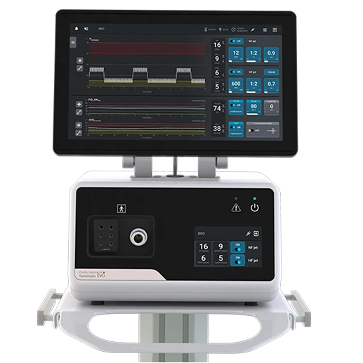 TwinStreamTM EVO is the newest addition to our range of jet ventilators and embodies more than 35 years of expertise in jet ventilation. Its modern design, user-friendly interface and 15.6″ touchscreen display make for a seamless integration into any hospital environment.
